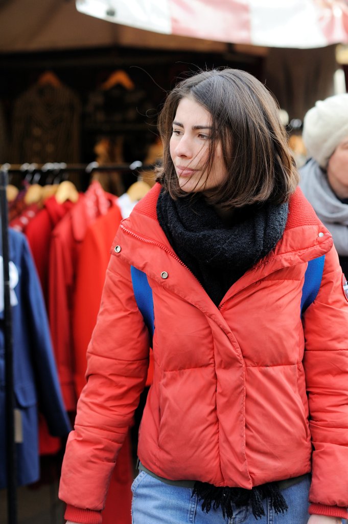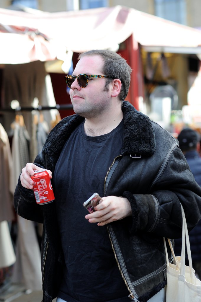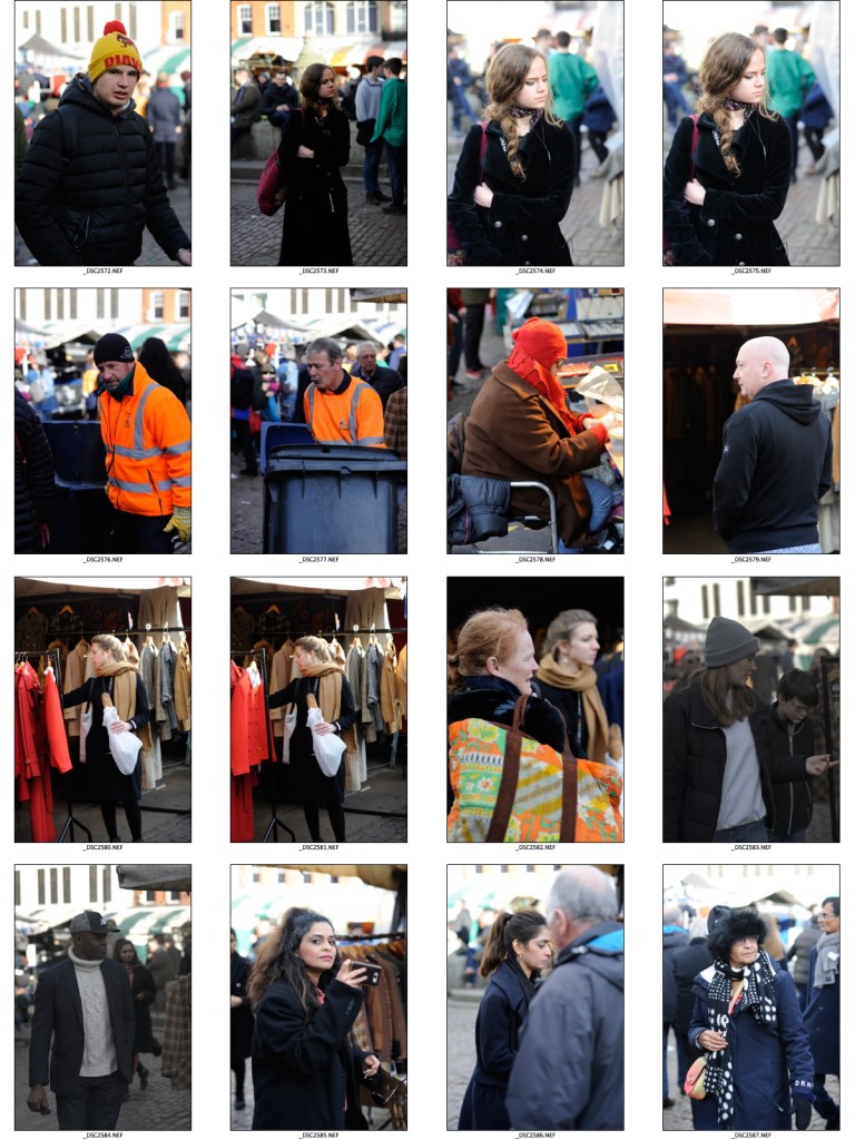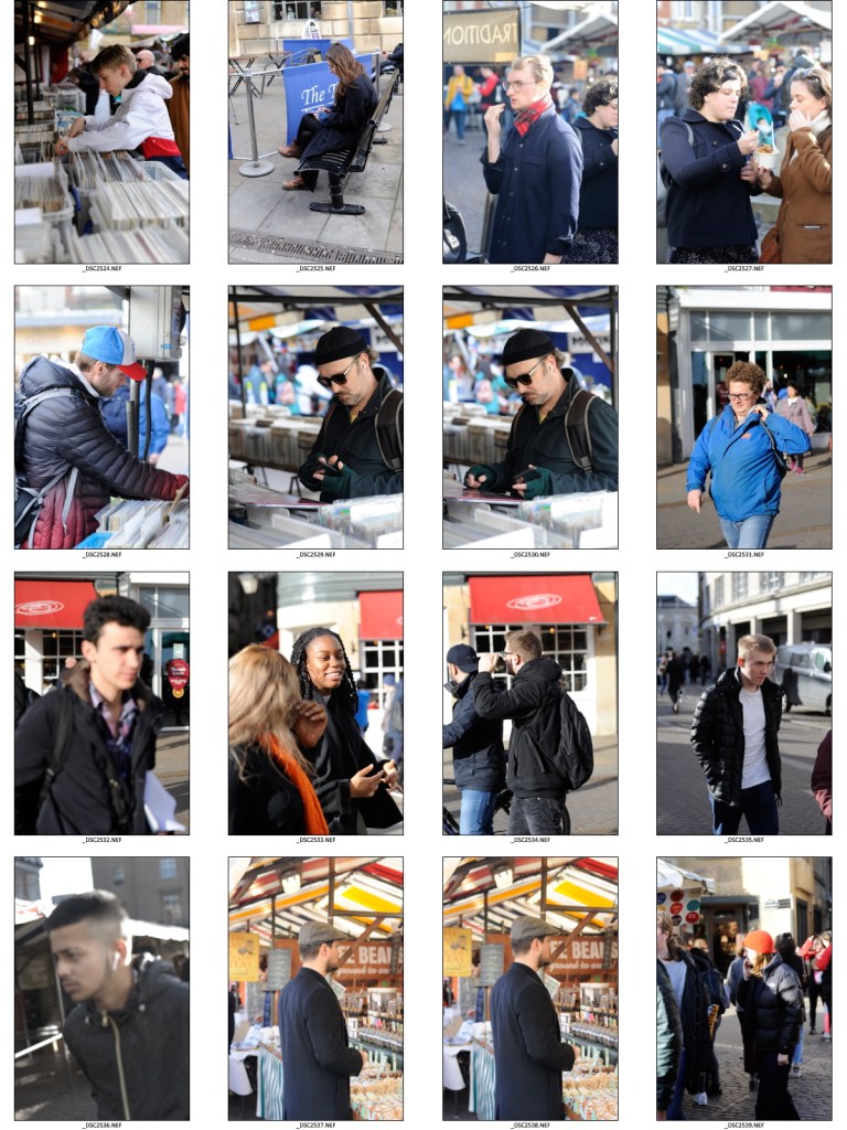 Initially I found this exercise quite difficult, first because it felt a bit intrusive and that it was possibly wrong to be taking people’s photographs without asking them first; and secondly because of the technical challenges this exercise created. As it was a bright day it was straightforward to shoot with a sufficiently fast shutter speed and wide aperture to freeze the subject in the frame and render the background out of focus, however, focussing on the subject’s face and getting the camera to lock-on did not always happen. This was in part because I did not initially think about where to position myself to begin with, however, after some trial and error, I realised that I needed to stand somewhere where people would naturally slow down giving me time to focus and take their picture. It also had to be somewhere where I could stand relatively unnoticed, ideally have a background that was not too distracting and was not facing into the sun. One of the places that fulfilled most of these criteria was standing by a second-hand record stall. This had the added bonus that people tended to be concentrating on what they were looking for and so were unaware of me taking pictures and where the LPs gave provided some context to the image.