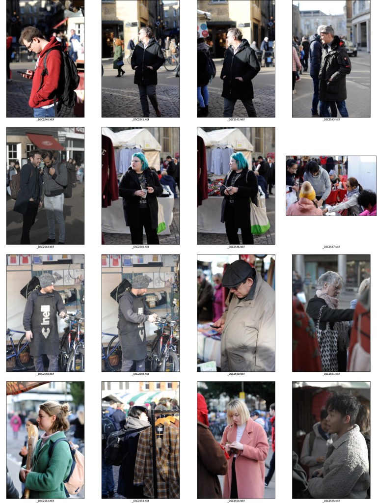 I took the photographs for this exercise after having taken pictures for assignment one and initially I felt very uncomfortable. Although I was in a busy market square and there were lots of people taking pictures on their phones, the fact that I was trying to take pictures of people without engaging with them beforehand did feel intrusive. At one stage I did consider using my phone instead of my camera but I find it difficult to hold, even with its grippy case, and I find using a screen instead of a view finder very alien.