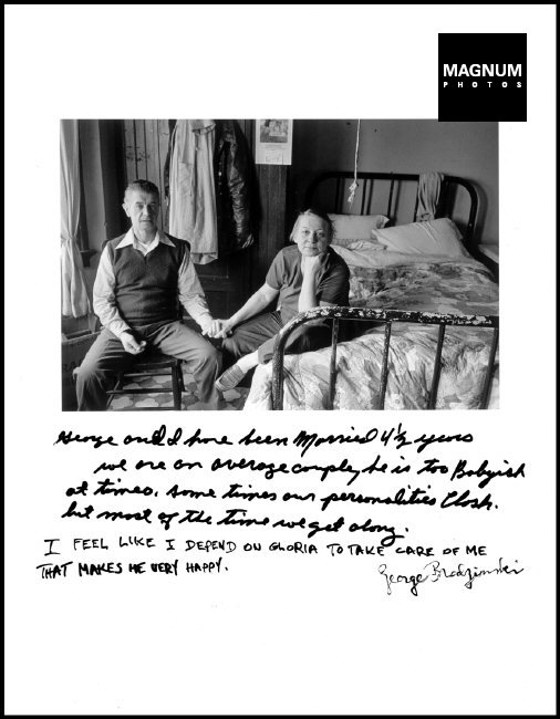 Goldberg used the same approach in his series Nursing Home, produced in 1985, which is a collection featuring images and image/text combinations of nursing home residents and carers.