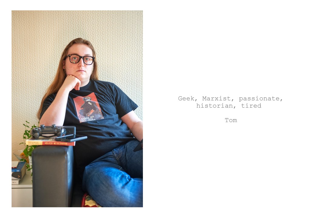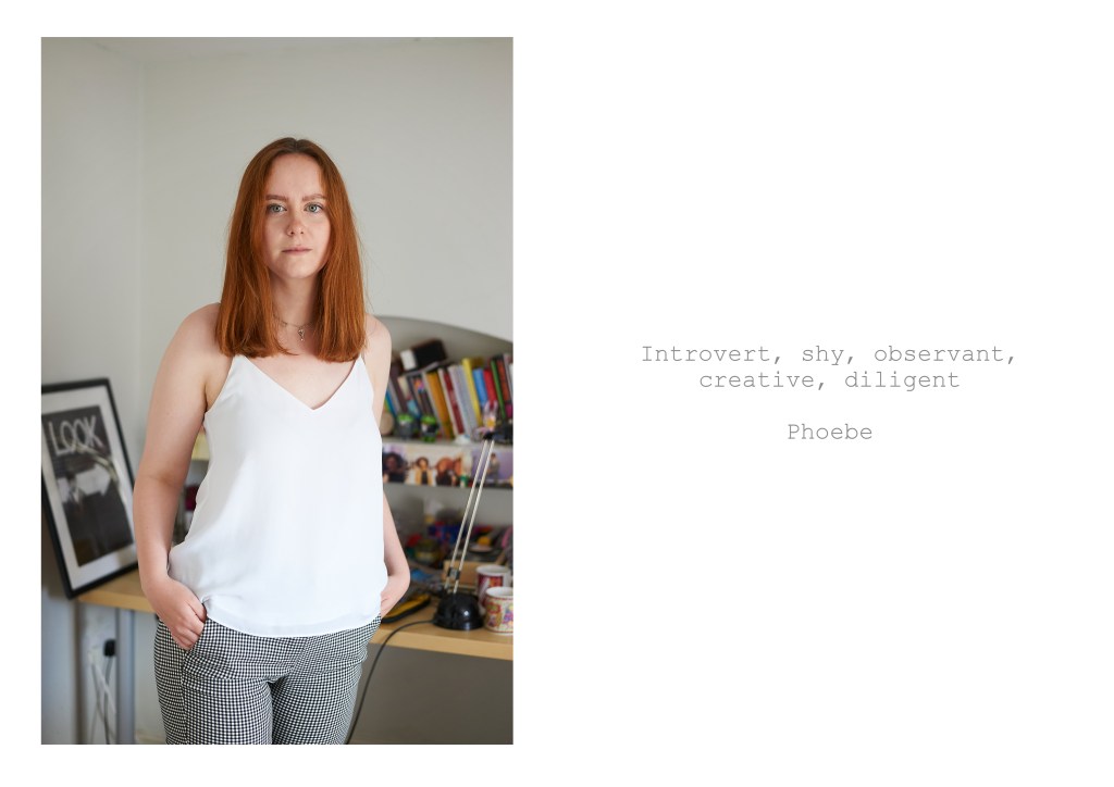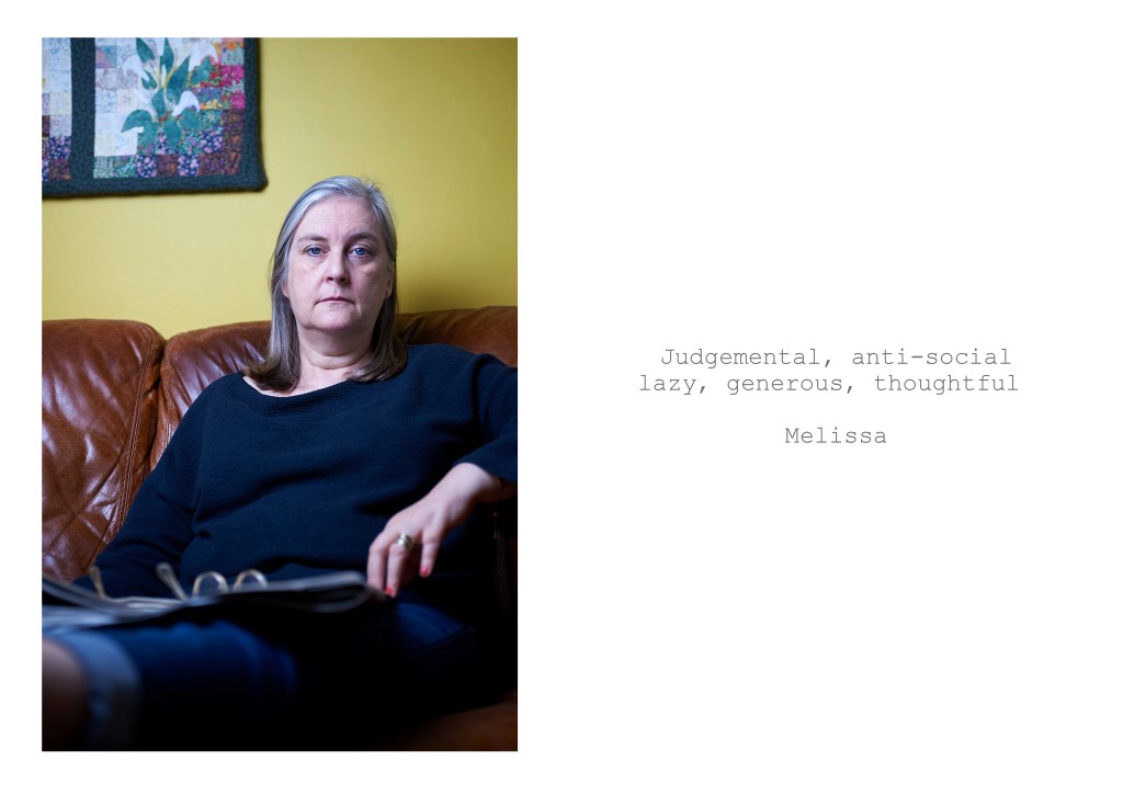 After tackling landscape for assignment four, for this assignment I wanted to revisit portraiture and look at the ideas of identity and self-identity. My aim was to create a series of images that would combine two elements covered in the course, background as context and image and text. My idea was to take portraits of members of my family and to combined them with text provided by the person being photographed. I initially asked the subjects to describe themselves in five words but later added the option of writing a short sentence instead.
