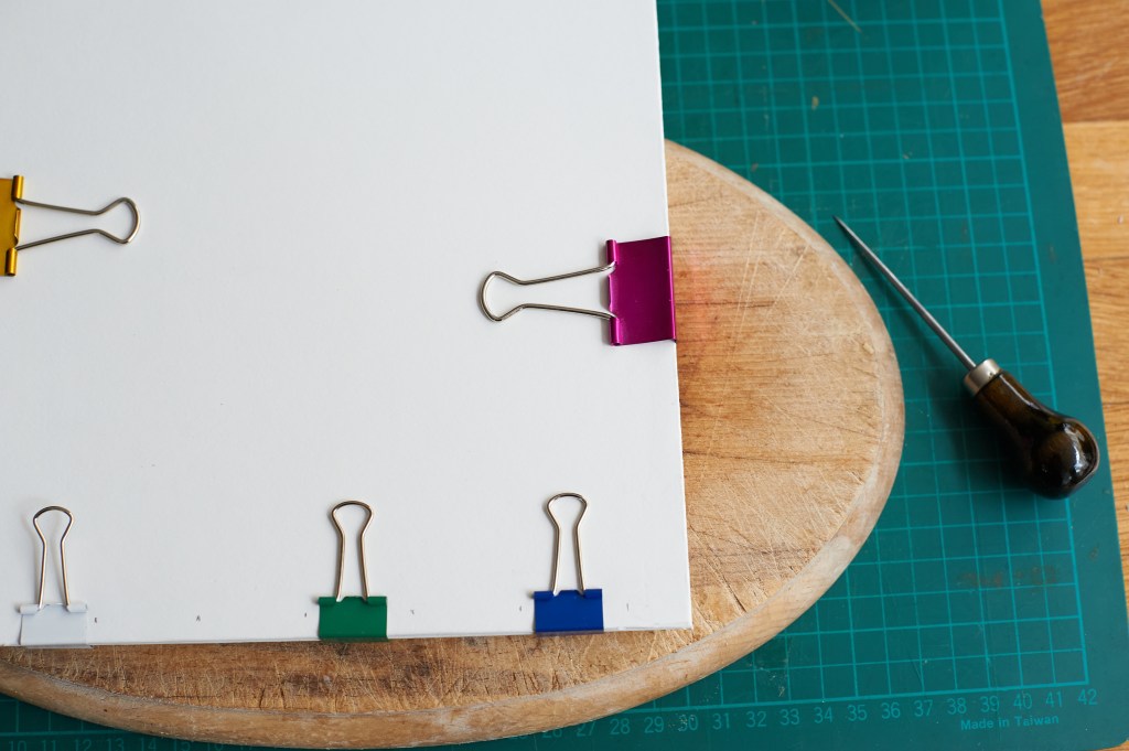 Once the covers were complete the next task was to collate the images and covers, mark and make the holes and sew all the elements together. This was relatively straightforward and the instruction easy to follow. However, I did not get pull the binding thread tight enough to begin with, so some of the binding is a bit loose. I also made the mistake of not inserting a protective layer of card between the clips and the book and so ended up with marks on the covers.